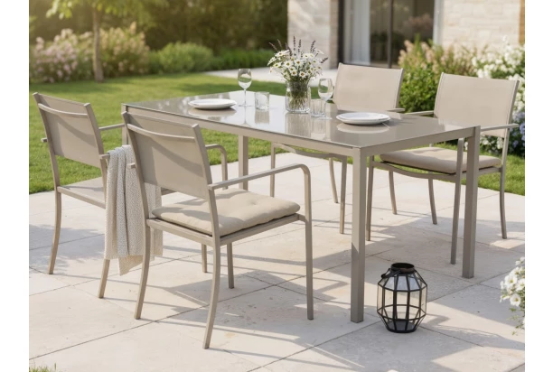 Dopřejte si stylové stolování pod širým nebem s moderním zahradním jídelním setem, který spojuje eleganci, funkčnost a odolnost. Souprava obsahuje prostorný jídelní stůl a čtyři pohodlné jídelní židle, takže je ideální pro rodinné chvíle i posezení s přáteli. Kombinace pískově šedého kovu, tvrzeného skla a umělé tkaniny působí nadčasově a zároveň svěže moderně. Pevná kovová konstrukce zajišťuje stabilitu, zatímco skleněná deska stolu dodává celé sestavě lehkost a snadnou údržbu. Židle s výpletem poskytují komfort i během horkých letních dnů. Obdélný jídelní stůl o rozměrech 150 × 80 cm nabízí dostatek prostoru pro společné snídaně na slunci, pohodové obědy i dlouhé večeře během teplých letních večerů. Tento elegantní zahradní set se stane přirozeným centrem každé moderní terasy, zahrady či balkonu a vytvoří ideální místo pro sdílení nezapomenutelných okamžiků.