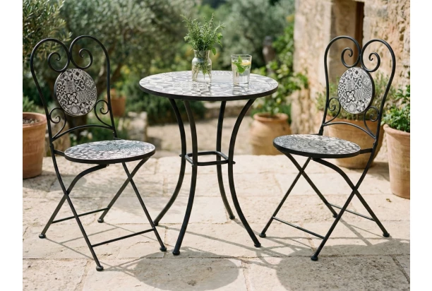 Kovová zahradní souprava s motivem černo-bílé mozaiky najde své místo nejen na venkovní zahradě a balkonu, ale také v interieru. Obsahuje kulatý stolek a 2 skládací židle, které můžete snadno uschovat a ušetřit tak okolní místo. Židle jsou včetně sedacích polštářků pro pohodlně měkké posezení. Tato malá sestava zahradního nábytku doplní příjemné prostředí na jakékoliv terase i na balkoně, zároveň bude skvěle vypadat v zimní zahradě anebo třeba v předsíni, kde vytvoří stylové zákoutí.