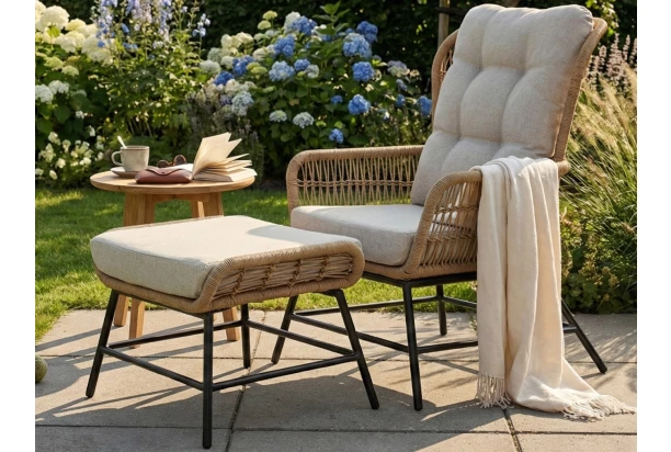 Dopřejte si pohodlí a styl v jednom. Toto atraktivní zahradní křeslo s taburetem má stabilní kovovou konstrukci doplněnou elegantním výpletem z umělé imitace ratanu, který dodává nábytku elegantní a nadčasový vzhled. Díky měkkým polštářům si užijete komfortní posezení během celého dne. Součástí setu je praktický taburet, který můžete využít jako pohodlnou opěrku pro nohy při relaxaci nebo jako samostatné malé sedátko třeba pro návštěvu. Křeslo je ideální pro chvíle odpočinku, posezení u kávy nebo při čtení oblíbené knihy. Skvěle se hodí na terasu, zahradu či balkon, ale díky svému stylovému designu bude stejně dobře vypadat i v interieru vašeho bytu, kde vytvoří příjemnou a útulnou atmosféru.