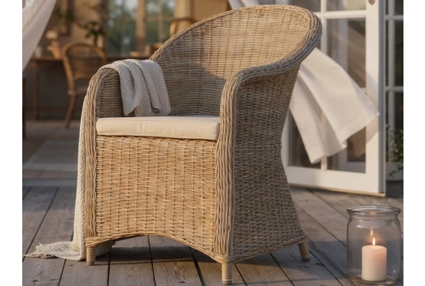 Elegantní zaoblené křeslo z umělé imitace ratanu přináší dokonalé spojení stylu, pohodlí a praktičnosti. Jeho jemně tvarovaná silueta působí vzdušně a nadčasově, zatímco jeho výplet dodává nádech tradice inspirované přírodními materiály. Součástí křesla je světle béžový polstr, který zajišťuje příjemný komfort při sezení. Ergonomicky tvarované opěradlo poskytuje pohodlí například při posezení u kávy, rodinného oběda nebo večerního posezení s přáteli. Díky odolné imitaci ratanu je křeslo navrženo tak, aby bez obav čelilo povětrnostním vlivům – slunci, větru i lehkému dešti. Skvěle se proto hodí na zahradu, terasu či balkon, kde vytvoří příjemné místo k odpočinku. Stejně působivě však vynikne i v interiéru, kde se stane elegantním doplňkem obývacího pokoje, zimní zahrady, chodby nebo jídelny. Křeslo můžete umístit samostatně jako stylový solitér, nebo jej zakomponovat k jídelnímu stolu. Ať už ho postavíte kamkoliv, vždy dodá prostoru nádech elegance a útulnosti.