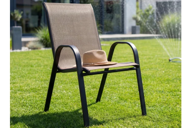 Moderní zahradní židle se zaoblenou kovovou konstrukcí a područkami poslouží u zahradního stolu nebo i samostatně. Sedací části vyrobeny z hnědé umělé tkaniny, která odolná vůči vlivům venkovního prostředí. U tohoto zahradního křesla je možné stohovat více kusů na sebe a ušetřit tak okolní prostor při skladování.