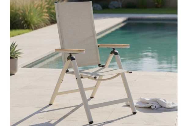 Polohovatelné zahradní křeslo v imitaci přírodního dřeva s jemně béžovým kovem propojuje moderní design s hřejivým dojmem přírody. Sedák v imitaci umělé tkaniny je odolný vůči venkovním vlivům a polohovatelné opěradlo lze sklopit do několika úhlů – až do relaxační polohy, ve které si budete příjemně odpočívat anebo si užívat příjemných letních paprsků během opalování.