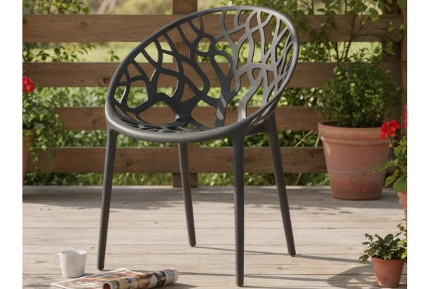 Zaoblená zahradní židle má zajímavý moderní design a je vyrobena z odolného polypropylenového plastu v antracitové barvě. Je využitelná na zahradě, na balkoně nebo i v interieru u jídelního stolu.