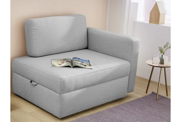 Praktické rozkládací křeslo oceníte vy i vaše návštěva – snadno rozložíte na pohodlné lůžko pro hosty. Očalouněno světle šedou tkaninou a doplněno opěrným polštářem. Úložný prostor pod sedákem využijete například pro uschování ložního prádla nebo sezónních věcí.