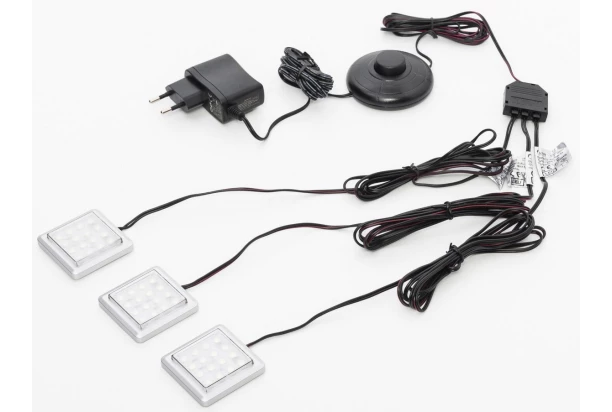 Sada osvětlení obsahuje 3 kusy bodových LED světel pro univerzální nasvícení vitrín, polic či jakýchkoliv podhledů nábytku. Barva světla studená bílá.