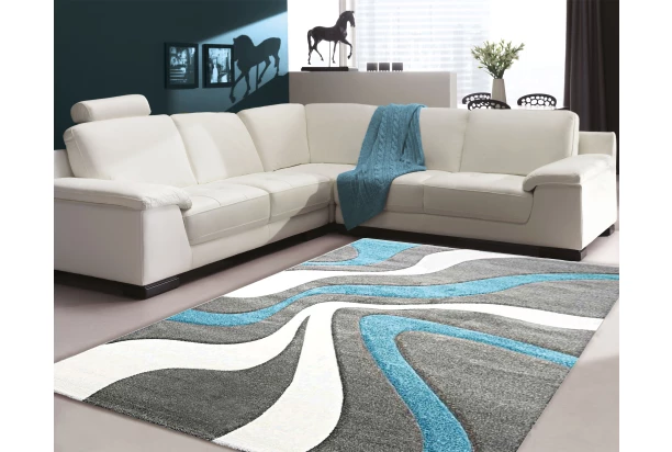 Koberec s kreativním vzorem vlnovek dodá šmrnc Vaší podlaze. Barva tyrkysová/světle krémová/šedá. Rozměr 120×170 cm.
