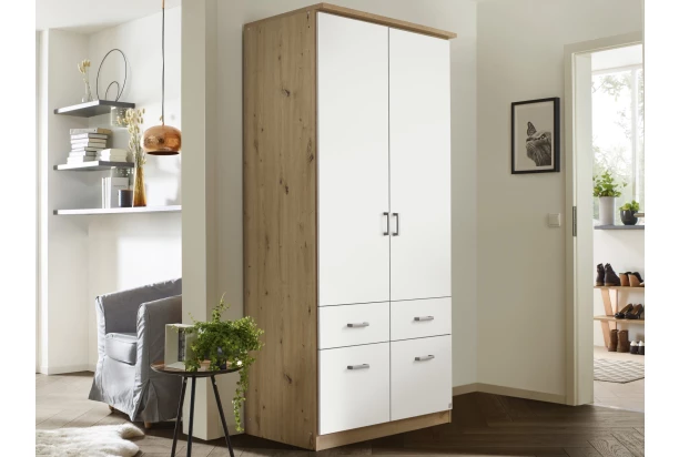 Šatní skříň o šířce 91 cm z programu Bremen je oblíbená pro svou praktičnost a dobré zpracování. Vyrobena v dekoru dub artisan/bílá. Nabízí úložné prostory za 2 otočnými dveřmi a 4 zásuvky pro přehledné ukládání oblečení, prádla a doplňků. Z jednotlivých elementů série Bremen můžete navíc sestavit libovolně velkou šatnu a přizpůsobit si tak úložné prostory podle individuálních potřeb.