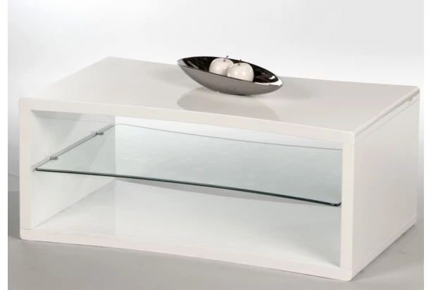 Leskle bílý konferenční stolek doplňuje skleněná police a extravagantně zaoblené boční strany. Dokonale se hodí do interieru s moderním lesklým nábytkem.