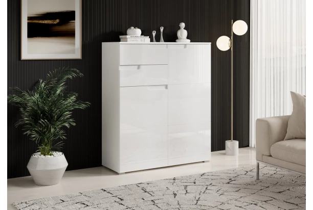 Vyšší skříňka z řady Spice se vyznačuje lesklými bílými povrchy s extravagantní profilací a ideálně se hodí do nadčasově zařízeného bytu. Obsahuje 2 zásuvky a 2 dveře.