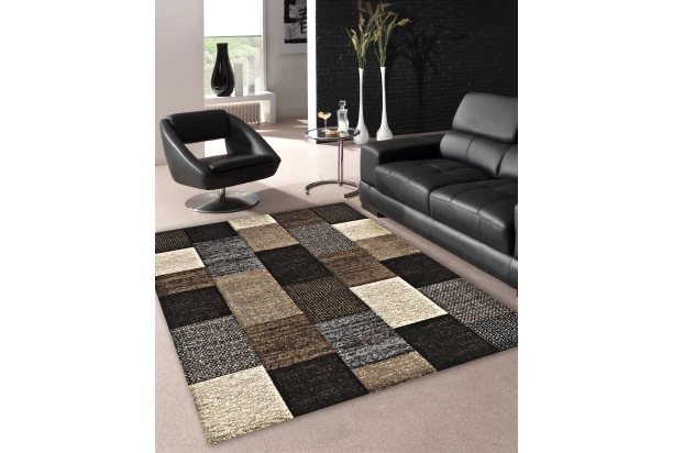 Originální vzor koberce opticky připomíná texturu tkaniny. V kombinaci hnědo-krémovo-šedé barvy. Rozměr 120×170 cm.