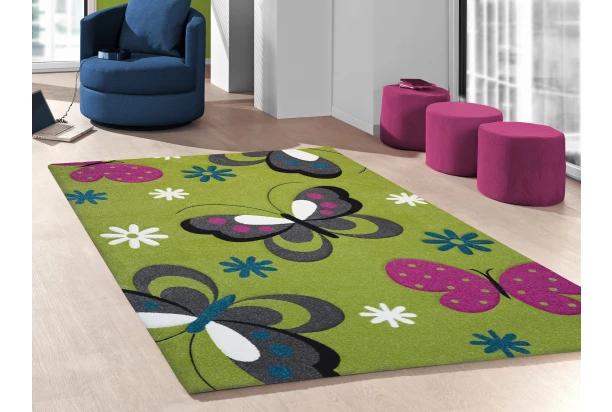 Krásný zelený koberec se vzorem barevných motýlů a kytek se hodí do dětského pokoje. Rozměr 120×170 cm.