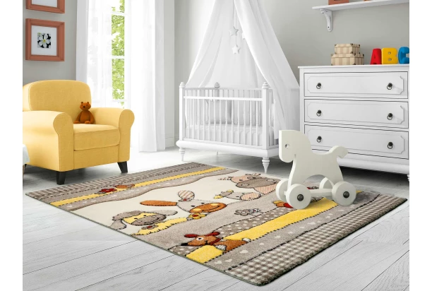Krásný koberec se vzorem krajiny se zvířátky se hodí do dětského pokoje. Rozměr 120×170 cm.