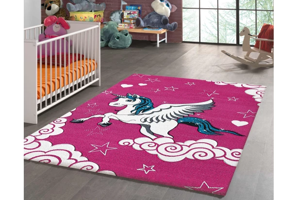 Krásný koberec se vzorem létajícího jednorožce a hvězdiček se hodí do dětského pokoje. Rozměr 120×170 cm.