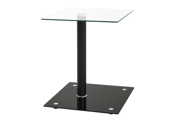 Praktický přístavný stolek o čtvercovém půdorysu je vyroben z kovu, čirého skla a černého skla. Poslouží pro praktické odkládání předmětů (např. odkládání věcí vedle sedačky, na lampičku, vázu, dekorace nebo třeba umístění uměleckých předmětů).