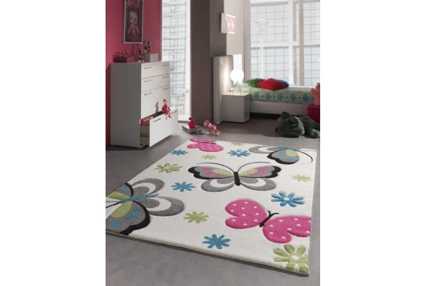 Krásný krémový koberec se vzorem barevných motýlů a kytek se hodí do dětského pokoje. Rozměr 120×170 cm.