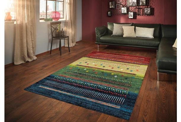 Krásný pestrobarevný koberec je doplněn etnickými vzory. Rozměr 80×150 cm.