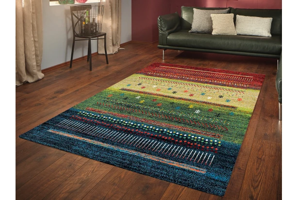 Krásný pestrobarevný koberec je doplněn etnickými vzory. Rozměr 160×230 cm.