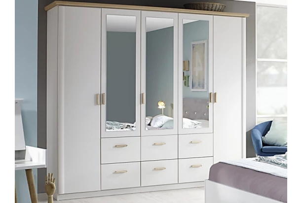 Šatní skříň se zásuvkami a zrcadly o celkové celkové šířce 232 cm z kolekce Kolding v půvabném skandinávském stylu, který je oblíbený napříč generacemi. Bílé linie nábytku doplňují prvky masivního jasanového dřeva pro vytvoření opravdu stylové atmosféry v prostoru ložnice.