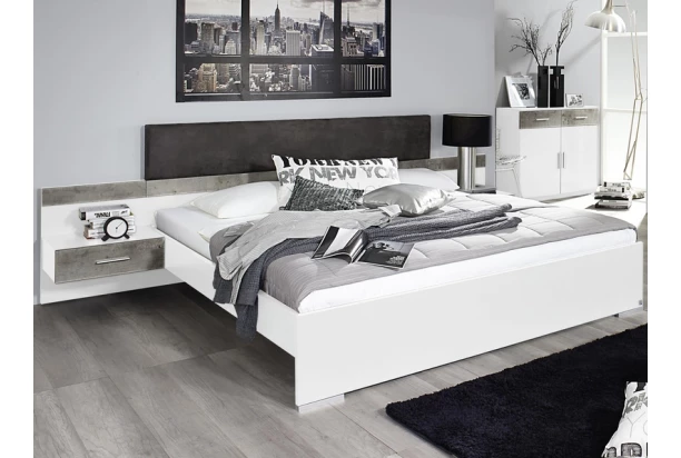 Moderní bílá manželská postel o rozměru lůžka 160×200 cm z kolekce Penzberg je doplněna zajímavými aplikacemi v imitaci šedého betonu a polstrováním zadního čela – může být skvělou inspirací pro vybavení módní ložnice.