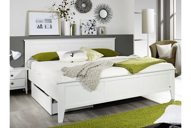 Manželská postel o rozměru lůžka 180×200 cm z kolekce Rosenheim – vychutnejte si romantické kouzlo bílého nábytku s nádechem venkovského stylu. Dekorativní rámy konstrukce, univerzálnost bílé barvy i kvalitní zpracování přispívají k vytvoření příjemné atmosféry v prostoru ložnice.