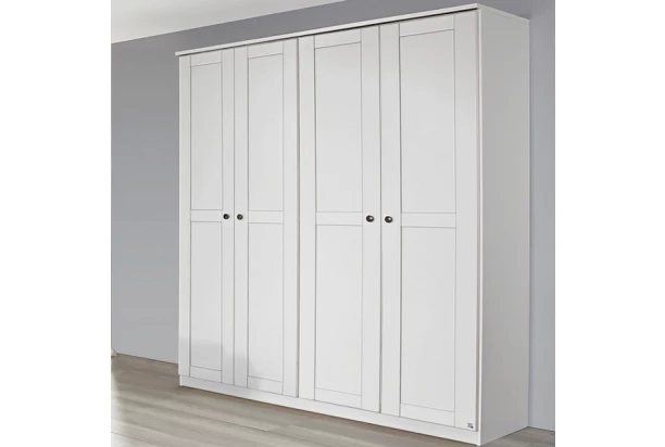 Šatní skříň se 4 otočnými dveřmi o celkové šířce 181 cm z kolekce Rosenheim – vychutnejte si romantické kouzlo bílého nábytku s nádechem venkovského stylu. Dekorativní rámy, univerzálnost bílé barvy i kvalitní zpracování přispívají k vytvoření příjemné atmosféry v prostoru ložnice.