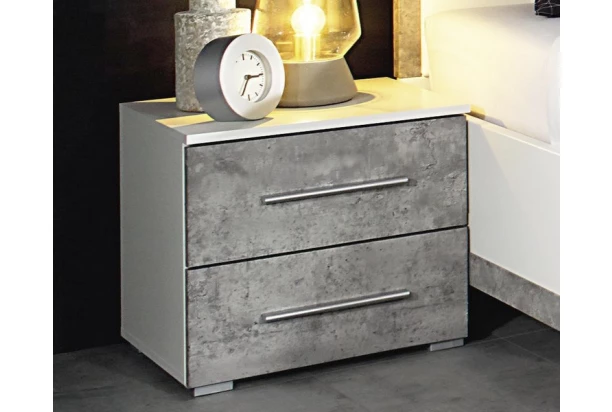 Noční stolek z kolekce Siegen – pro zařízení kvalitní a funkční ložnice, kde se setkává elegance i módní styl. Čisté bílé plochy doplňují aplikace v imitaci šedého betonu.
