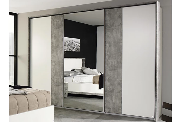 Šatní skříň s posuvnými dveřmi a zrcadlem o celkové šířce 271 cm z kolekce Siegen – pro zařízení kvalitní a funkční ložnice, kde se setkává elegance i módní styl. Čisté bílé plochy doplňují aplikace v imitaci šedého betonu.