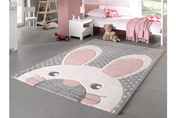 Krásný dětský koberec s hustým vlasem a motivem zajíček vynikne v každém dětském pokoji a potěší. Rozměr 120×170 cm.