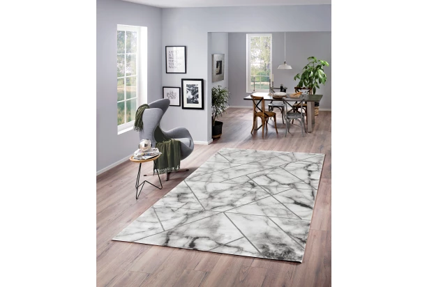 Koberec o obdélném rozměru 160×230 cm s nízkým a příjemně hustým vlasem. Stylový šedo-stříbrný mramorový design připomíná luxusně dlážděnou podlahu a dokonale se hodí do moderně zařízeného bytu.