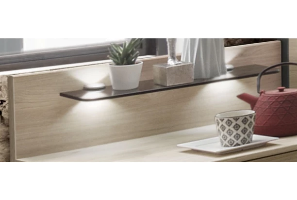 Sada 2 ks osvětlený panel k nočnímu stolku z kolekce Brüssel – moderní, stylový a zároveň kvalitní nábytek pro vybavení praktické ložnice. Nástavný zádový panel v dekoru kamenný dub obsahuje poličku z kouřového skla a bodové osvětlení, které snadno zapnete pomocí zabudovaného tlačítka. Vytvoříte si tak snadno kdykoliv příjemnou večerní atmosféru.