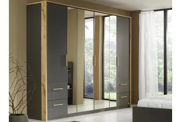 Šatní skříň s otočnými dveřmi z kolekce Josselin – tmavě šedé plochy s dubovým dřevodekorem jsou ideální volbou pro vytvoření příjemně útulné a intimní atmosféry ve Vaší ložnici. Nábytek spojuje modernost s přirozeností díky kombinaci s masivním dubovým dřevem u prvků jako jsou úchytky. Skříň o šířce 226 cm je vybavena 6 dveřmi, 4 zrcadly a 4 praktickými zásuvkami na drobné prádlo. Vnitřní prostory je možné navíc doplnit o další police podle individuální potřeby.