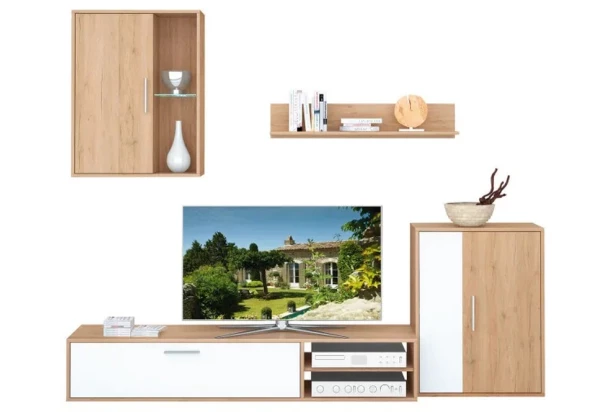 Malá obývací stěna v kombinaci dub san remo/bílá pasuje do garsonek anebo malých obýváků. Cenově výhodná sestava obsahuje čtyři díly, které můžete využít i samostatně.