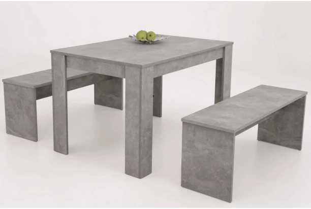 Jídelní set v módní imitaci šedého betonu můžete libovolně umístit v prostoru kuchyně anebo přímo u stěny a vytvořit tak útulné zákoutí. Obsahuje jídelní stůl a dvě lavice.