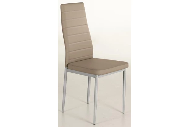 Oblíbená jídelní židle je potažena příjemně měkkou ekokůží v barvě cappuccino. Stříbrně lakovaná konstrukce z kovu zajišťuje stabilitu.