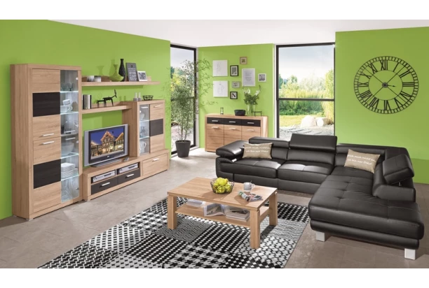 Dubový dekor dřeva doplňují originálně strukturované povrchy tmavě šedé pinie, které propůjčují obývací sestavě nezaměnitelný vzhled.