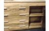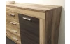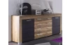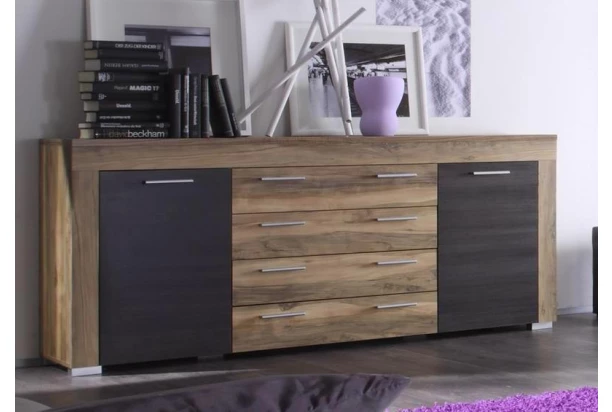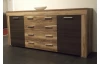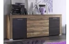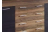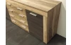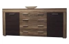 Široká komoda v působivé kombinaci saténového ořechu a hnědého dekoru touchwood nabízí za otočnými dveřmi a ve středových zásuvkách dostatek úložného prostoru.