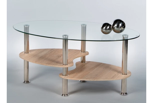 Oválný stolek z čirého skla obsahuje v dolní části 2 dekorativně zaoblené police v dubovém dekoru dřeva.
