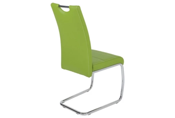 Moderní jídelní židle má zaoblený design, chromově lesklou konstrukci s praktickým madlem a komfortní sedák potažen ekokůží v zelené barvě.