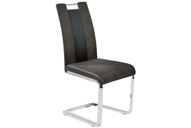 Elegantní jídelní židle na kovové podnoži v chromovém lesku. Pohodlné opěradlo doplněno praktickým hranatým madlem pro snazší manipulaci. Očalouněna kombinací černé ekokůže a šedé látky v zajímavé optice kůže.