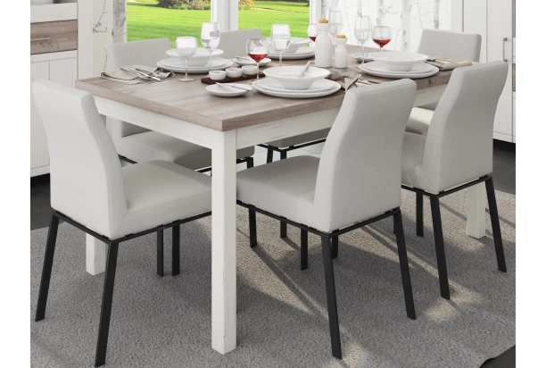Prostorný jídelní stůl osloví kvalitně propracovanou konstrukcí v kombinaci bělené pinie a šedého dubového dřevodekoru.