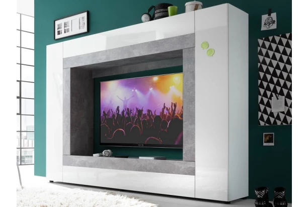 Kompaktní obývací stěna s velkým středovým prostorem pro televizi ukrývá v bočních částech praktické úložné prostory, kam můžete uschovat zbytek elektroniky. Nábytek v kombinaci bílého lesklu a imitace šedého betonu se dokonale hodí do mladistvě zařízeného bytu.