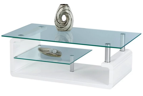 Moderní konferenční stolek se zajímavě členitou konstrukcí nabízí odkládací plochy ve více výškových úrovních. V kombinaci bílého lesku a čirého skla.