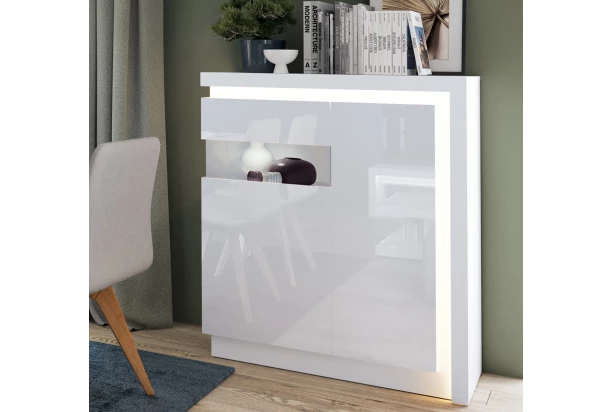 Skříňka s prosklením z programu Lyon – moderní minimalistický styl nábytku podtrhují zajímavě řešené rámy s podsvícením, které vytváří působivé linie v horizontálním i vertikálním směru. Nábytek v lesklém bílém provedení můžete navíc snadno sladit s jakýmikoliv barvami vašeho interieru.
