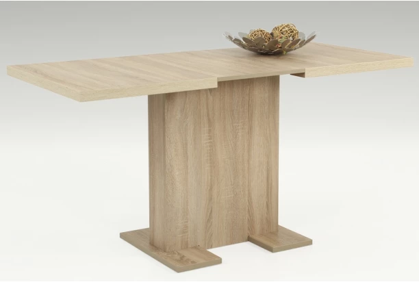 Menší jídelní stůl v trendovním stylu má širokou středovou nohu pro maximální stabilitu a rozkládací funkci jídelní desky. Vyroben v dekoru dub sonoma.