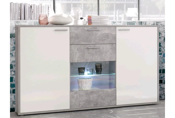 Široká komoda s prosklením Mountain,šedý beton/bílý lesk, s osvětlením