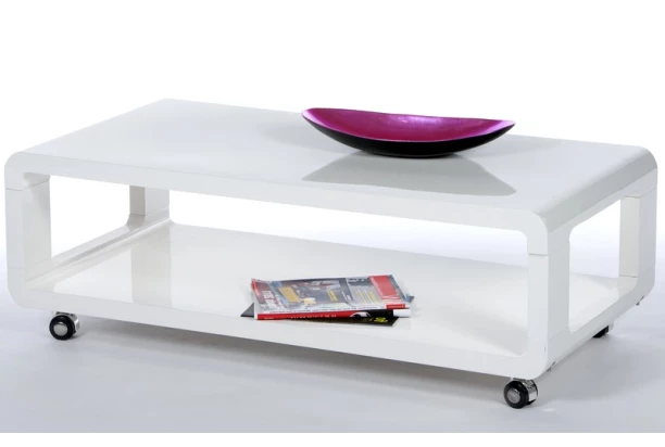 Konferenční stolek s lesklými bílými povrchy má zajímavý design zaoblených tvarů a skvěle vynikne vedle moderní sedačky.