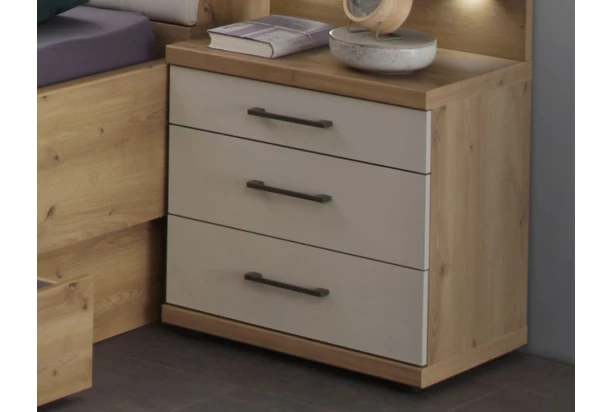 Set 2 kusů nočních stolků z kolekce Kanada – kvalitní nábytek pro zařízení moderní, útulné a zároveň praktické ložnice. Nábytek v dřevodekoru dub bianco s odstínem šedá šampaň vytvoří příjemné klima v prostoru vaší ložnice. Noční stolky můžete navíc libovolně doplnit osvětlenými zádovými panely se skleněnou poličkou, které podtrhnou večerní atmosféru v ložnici.