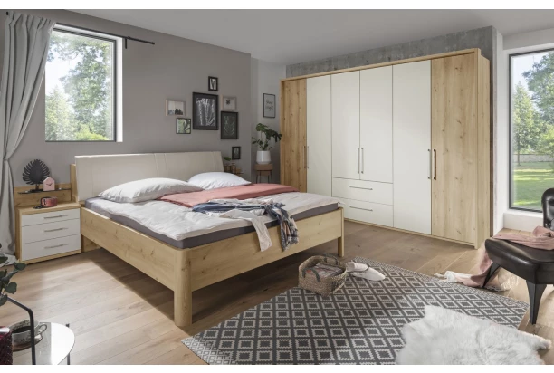 Postel s úložným prostorem z kolekce Kanada – kvalitní nábytek pro zařízení moderní, útulné a zároveň praktické ložnice. Nábytek v dřevodekoru dub bianco s odstínem šedá šampaň vytvoří příjemné klima v prostoru vaší ložnice. Manželská postel ukrývá za výklopným polstrovaným čelem praktický úložný prostor, který můžete využít například pro uschování lůžkovin. Konstrukci postele můžete navíc libovolně doplnit bočními úložnými zásuvkami anebo praktickými lampičkami ke čtení.