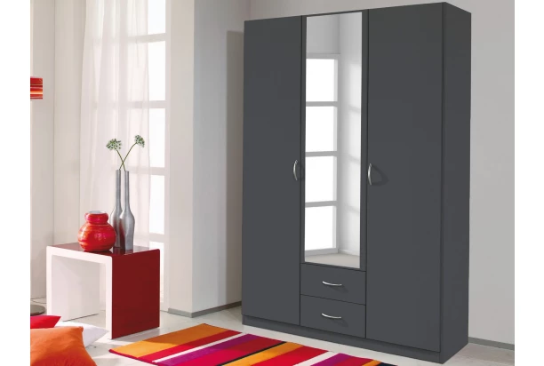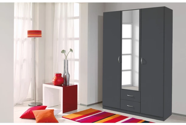 Šatní skříň z programu Case je vyrobena v barvě tmavě šedá a přináší do domácnosti jednoduchou eleganci a funkčnost. Konstrukce o šířce 136 cm obsahuje 3 dveře, 1 zrcadlo a 2 zásuvky.