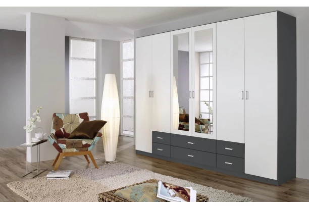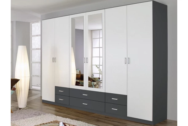 Široká šatní skříň s kombinací zásuvek, dveří a zrcadel nabízí dostatek úložných prostor pro přehledné ukládání i početného ošacení. V provedení tmavě šedá/bílá. Skříň můžete doplnit o další vnitřní police podle vlastní potřeby.